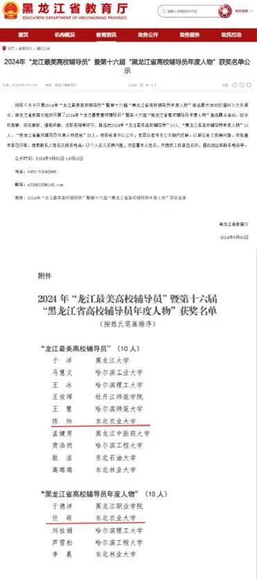 近日,由省委教育工委会同省委宣传部、省教科文卫体工会共同组织开展的2024年“龙江最美高校辅导员”暨第十六届“黑龙江省高校辅导员年度人物”推选展示活动圆满落下帷幕,共推选出2024年“龙江最美高校辅导员”10人,“黑龙江省高校辅导员年度人物”10人。经资格审核、通讯评审、述职答辩等环节的激烈角逐,我院辅导员陈帅荣获得2024年“龙江最美高校辅导员”荣誉称号。