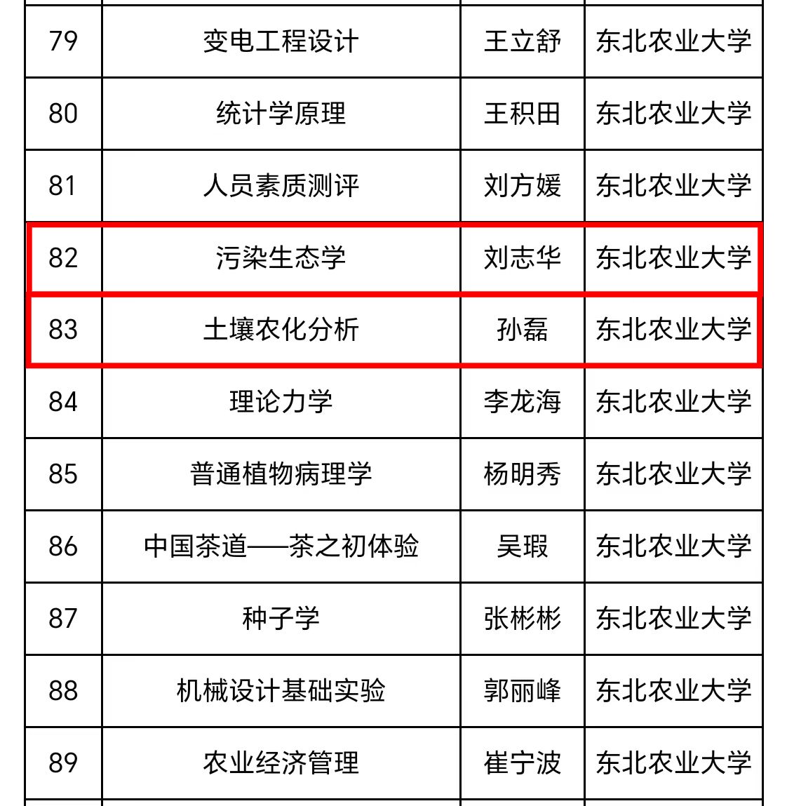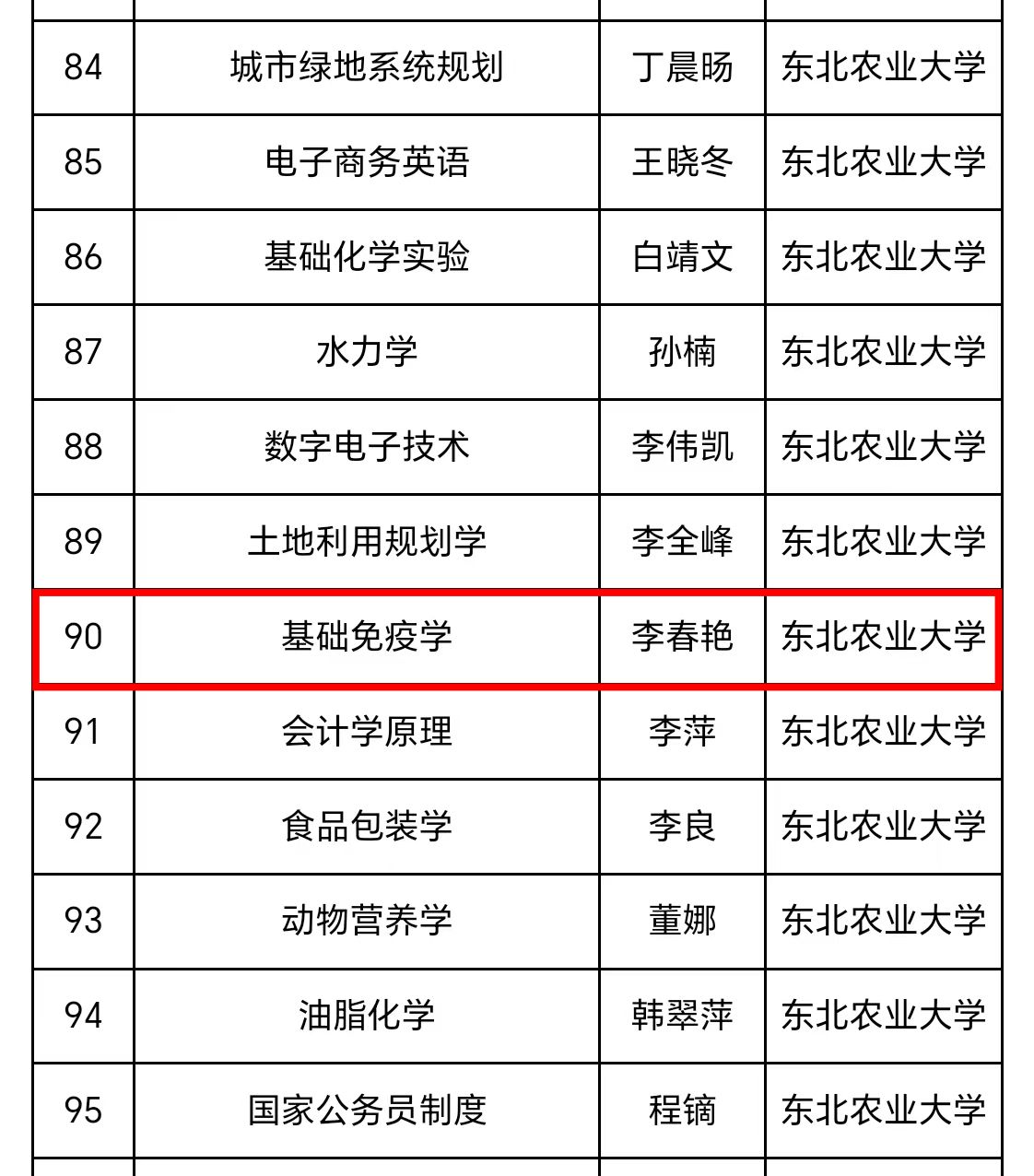 10月9日,黑龙江省教育厅对第三批省级一流课程认定结果进行公示,我校共有27门课程被认定为省级一流课程。其中我院李春艳教授主讲的《基础免疫学》喜获线下一流课程认证,我院刘志华副教授主讲的《污染生态学》与孙磊副教授主讲的《土壤农化分析》喜获线上线下混合式一流课程认证。