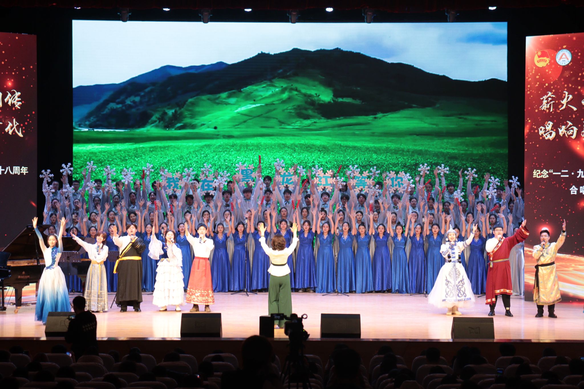 音乐宛转悠扬,雪花闪闪发光,一首《我在黑龙江等你》细腻生动的诠释了师生们对家乡的热爱,对黑土的眷恋。悠扬动听的旋律,身姿柔美的伴舞,闪闪发光的雪花再次将合唱推向了高潮,小朋友们的参与更是为整首歌曲装点了一抹靓丽的色彩。