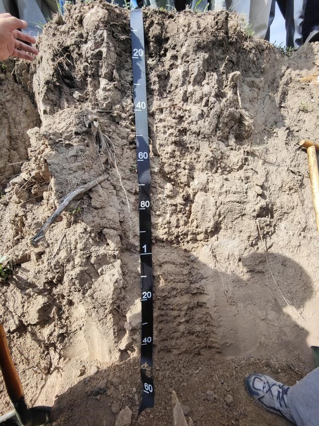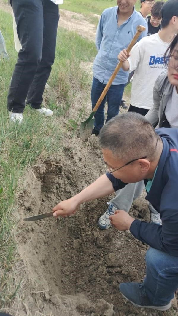 在肇东、大庆市大同区、杜尔伯特蒙古族自治县同学们观察了黑钙土、草甸碱土和风沙土的土壤剖面,学习剖面修整,开展了土壤发生层划分、每层土壤颜色、结构、质地、紧实度、石灰性反应、新生体、植物根系等剖面性态描述。
