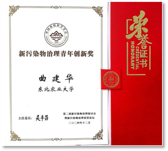 2024年12月8日,中国环境科学学会联合国家自然科学基金委员会、中国环境科学研究院、生态环境部环境规划院共同主办的第二届新污染物治理研讨会暨新污染物治理前沿论坛在北京市召开,闭幕式上第一届“新污染物治理青年创新奖”(全国仅20席,一年一次)评选结果正式揭晓。东北农业大学304am永利集团官网院长曲建华教授在众多优秀候选人中脱颖而出,作为黑龙江省唯一获奖者,荣获此项殊荣。
