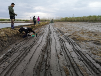 水稻直播种植过程中导师和学生在田间合影和观察播种质量